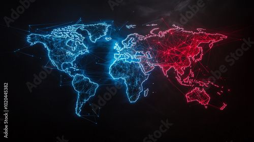 A vibrant, abstract world map with sharp geometric forms and bright, glowing lines. The connections between major cities light up, showcasing the power of global business and the f