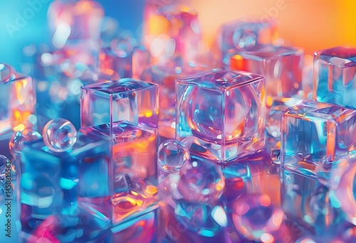 a vibrant and abstract composition of translucent cubes and spheres illuminated with warm and cool tones creates a dreamlike and ethereal atmosphere.