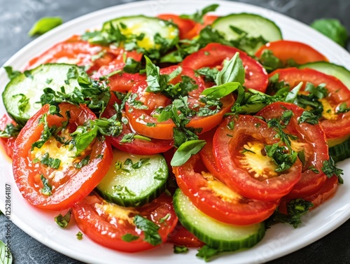 A vibrant and appetizing vegetable salad featuring cucumbers, tomatoes, and fresh herbs. This refreshing side dish is perfect for warm weather or as a healthy option to complement any meal.