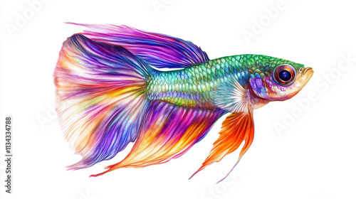 A vibrant and colorful depiction of a lime green and purple guppy fish with translucent, gradient-colored fins that resemble stained glass. The fish is captured mid-motion, tilted at an elegant angle