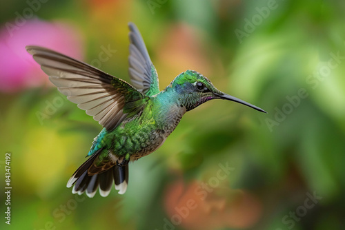 A vibrant and colorful hummingbird with its wings spread open, flying gracefully in nature. Great for wildlife and nature-themed designs or events.