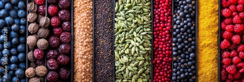 A vibrant and colorful image of spices and berries arranged in rows. The image symbolizes the diversity of flavors, the beauty of nature, and the art of culinary creativity. It evokes a sense of fresh