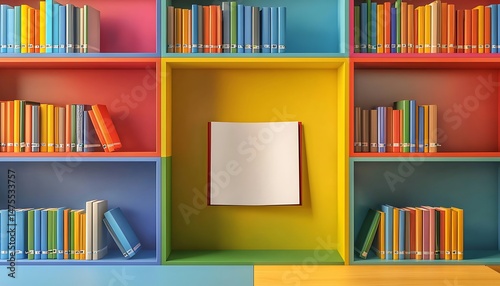 A vibrant and colorful library with neatly arranged shelves and a blank book on display