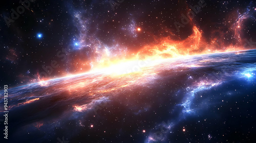 A vibrant and colorful nebula with fiery orange hues and bright blue stars in the foreground, creating a breathtaking cosmic landscape.