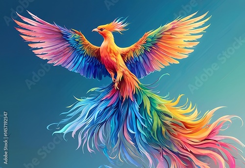 a vibrant and colorful phoenix with wings spread wide soars against a teal gradient background, showcasing its fiery plumage in a dynamic and artistic depiction.