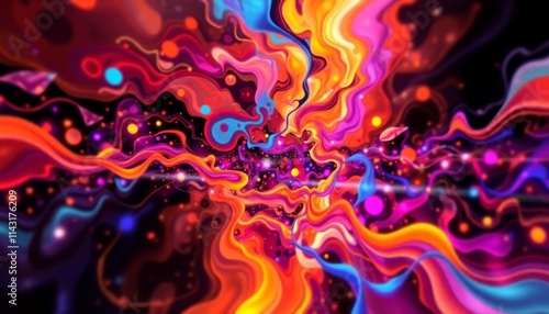 A vibrant and dynamic abstract artwork featuring swirling colors and glowing particles, reminiscent of a psychedelic experience. Perfect for trippy backgrounds and artistic concepts.
