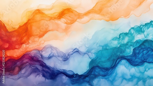 A vibrant and fluid abstract painting featuring curves and waves with swirling colors of blue, orange, and red.