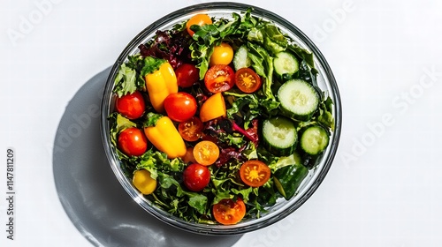 A vibrant and fresh salad featuring a mix of leafy greens, cherry tomatoes, cucumbers, and colorful bell peppers, artfully arranged in a glass bowl, isolated on a solid white background.