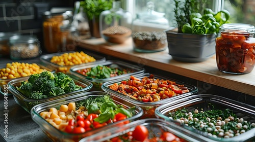 A vibrant and inviting spread of fresh vegetables, salads, and herbs displayed in glass containers on a kitchen countertop.