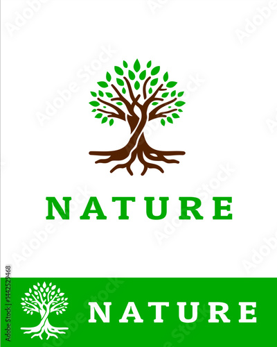 A vibrant and symbolic nature logo featuring a green leafy tree with intertwined trunks and deep roots isolated on white