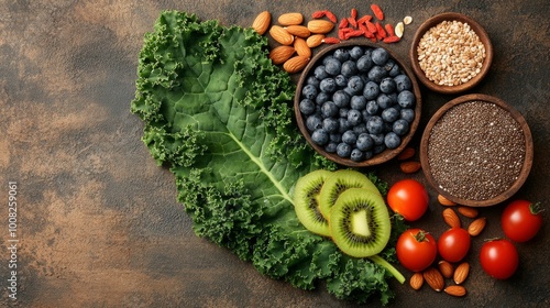 A vibrant arrangement features fresh kale leaves alongside bowls of blueberries, chia seeds, and almonds, complemented by ripe kiwis and cherry tomatoes on a rustic tabletop