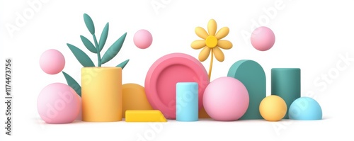 A vibrant arrangement of colorful geometric shapes and natural elements, showcasing creativity and playful design.