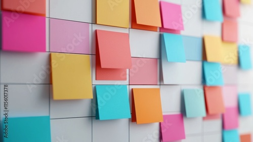 A vibrant arrangement of colorful sticky notes on a white board, showcasing organization, creativity, and brainstorming potential.