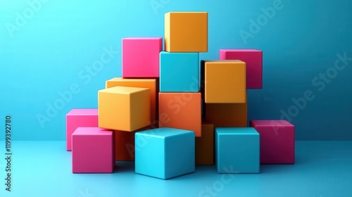 A vibrant arrangement of multicolored cubes stacked against a bright blue background, creating a playful and modern aesthetic.
