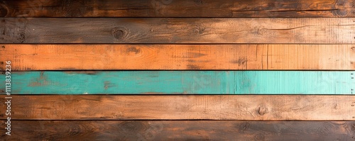 A vibrant arrangement of wooden planks in shades of brown, orange, and teal, showcasing rustic charm and texture.