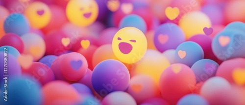 A vibrant array of colorful balls featuring smiling emojis with hearts, creating a playful and joyful atmosphere.