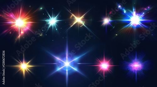 A vibrant array of colorful light flares against a dark background, creating a dazzling cosmic effect.