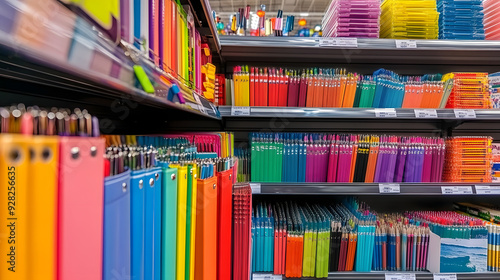 A vibrant array of notebooks, binders, and pens decorates a store shelf, inviting shoppers during the lively back-to-school shopping season