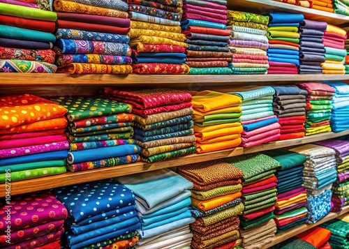 A vibrant assortment of colorful fabrics neatly arranged on shelves in a retail store, perfect for your crafting and sewing adventures. Unleash your creativity today!