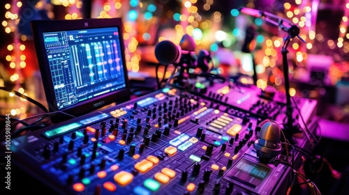A vibrant audio mixing setup with colorful lights and equipment for sound production.