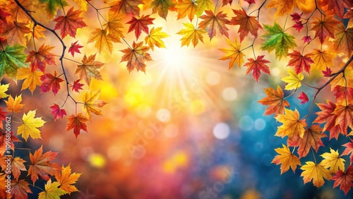 A vibrant autumnal backdrop featuring a frame of colorful maple leaves, dappled sunlight, and a soft bokeh background.