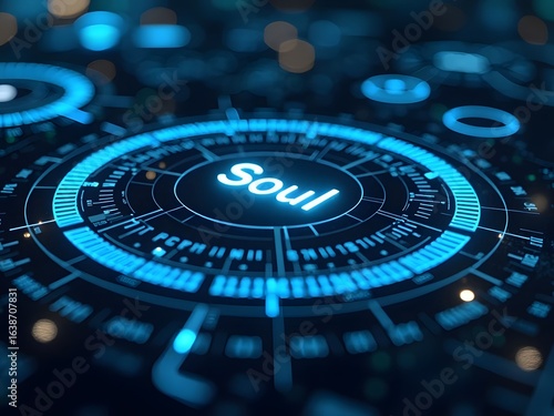 A vibrant blue futuristic interface showcases the word Soul within a concentric circular design, creating a captivating visual effect, horizontal composition.