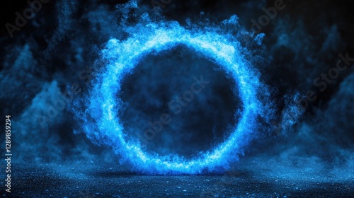 A vibrant blue powder forms a circular ring on a dark backdrop, creating a striking and abstract minimalist composition with dynamic movement.