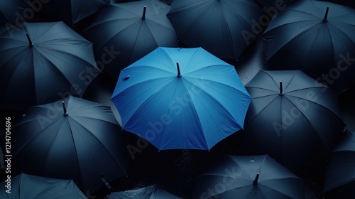 A vibrant blue umbrella stands boldly amidst a sea of black umbrellas, creating a striking contrast that catches the eye.