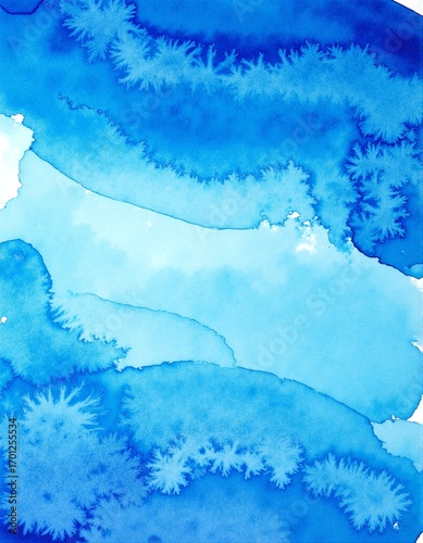 A vibrant blue watercolor painting featuring soft, flowing hues, accented with delicate white paint splashes that create a dreamy, ethereal effect.