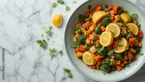 A vibrant bowl of fresh, colorful vegetables with lemon slices, showcasing a healthy and inviting meal option perfect for any occasion.