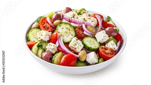 A vibrant bowl of Greek salad with chopped cucumbers, tomatoes, red onions