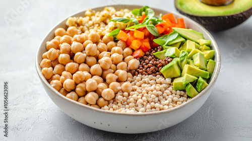 A vibrant bowl of healthy grains and vegetables, featuring chickpeas, diced avocado, and colorful peppers.
