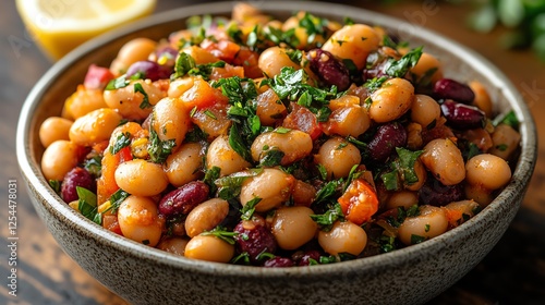 A vibrant bowl of mixed beans salad, featuring various beans and fresh herbs, garnished with lemon, showcasing a healthy and colorful dish perfect for any meal.