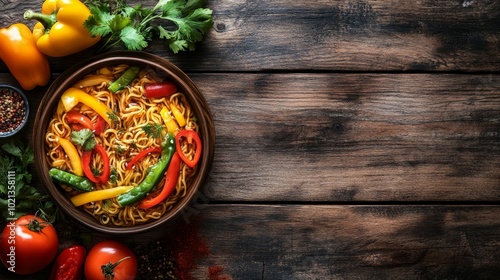 A vibrant bowl of noodles topped with colorful vegetables, surrounded by fresh ingredients on a rustic wooden table.