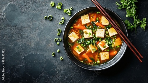 A vibrant bowl of tofu soup garnished with green onions and cilantro, served with chopsticks against a dark background.