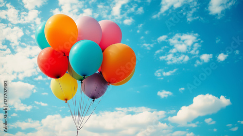 A vibrant bunch of helium balloons in various colors, floating against a bright blue sky with soft white clouds,