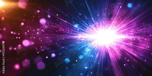 A vibrant burst of light with rays and particles in shades of pink, purple, and blue, creating a dynamic, cosmic effect. Concept Cosmic Light Explosion, Vibrant Color Palette, Particle Effects