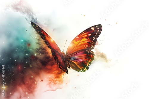 A vibrant butterfly emerges from a colorful, ethereal background, blending nature with cosmic elements in an artistic representation.