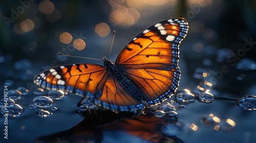 A vibrant butterfly rests on shimmering water droplets in a serene natural setting at dusk