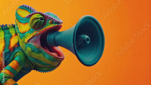 A vibrant chameleon creative announcement concept. A vibrant chameleon shouting into a megaphone against a gradient.