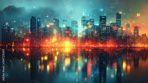 A vibrant city skyline at night, illuminated with colorful lights and digital effects.