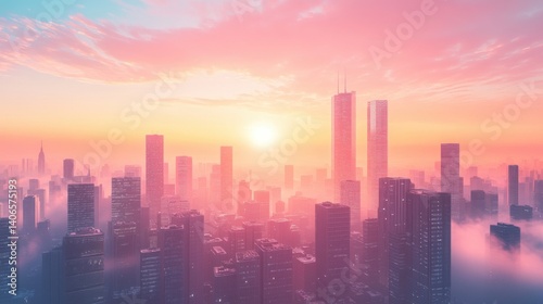 A vibrant city skyline at sunrise, featuring towering skyscrapers amidst a colorful sky and mist, creating a serene yet dynamic urban atmosphere.