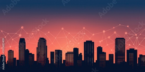 A vibrant city skyline at sunset, featuring silhouetted buildings against a gradient sky, with digital network connections overlaying the scene.