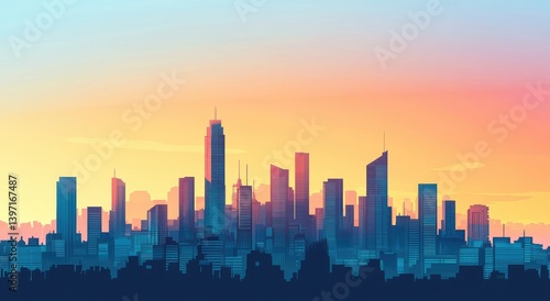 A vibrant city skyline at sunset, showcasing tall buildings and urban landscape.