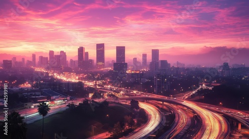 A vibrant city skyline illuminated by the first light of dawn, bustling streets below, skyscrapers towering, sky painted with hues of pink and orange, fresh start to the week