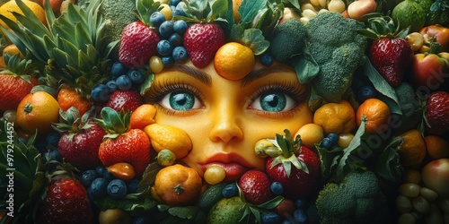 A vibrant city where every corner features lively fruits and veggies adding a playful touch to city life