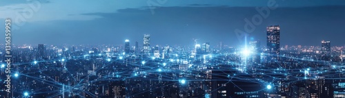 A vibrant cityscape at dusk, showcasing a network of illuminated lines connecting modern skyscrapers, creating a dynamic urban atmosphere filled with energy and innovation.