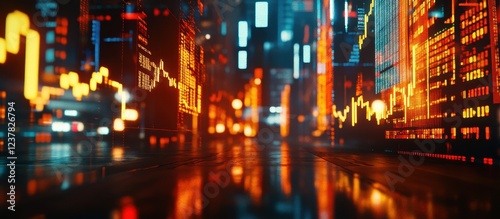 A vibrant cityscape at night, illuminated by glowing digital screens and dynamic financial graphs, reflecting on wet pavement.