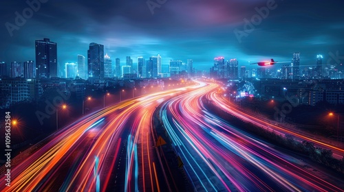 A vibrant cityscape at night with light trails from vehicles on a busy highway.