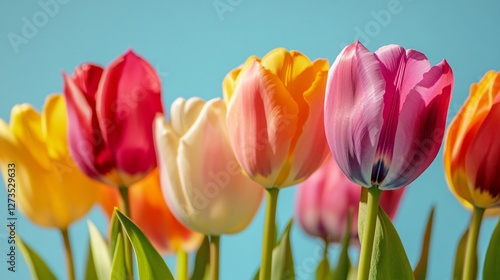 A vibrant close up of multicolored tulips celebrating the arrival of spring, isolated on a bright sky-blue background